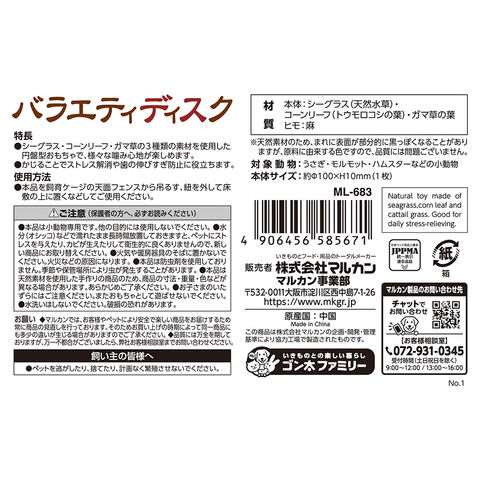 メーカー画像 マルカン バラエティディスク 4906456585671 20251217 y25m12 cngc 小動物 小動物用品 用品 ディスク うさぎ 兎 ウサギ モルモット デグー チンチラ ハムスター 遊ぶ 噛む かじる かじるおもちゃ おもちゃ オモチャ 円盤型 円盤 座る 天然素材100% 天然素材 ストレス発散 ストレス 発散 ストレス解消 ケージに取り付ける 吊るす つるす シーグラス コーンリーフ ガマ草 歯 歯の伸びすぎ 歯の伸びすぎ防止 予防