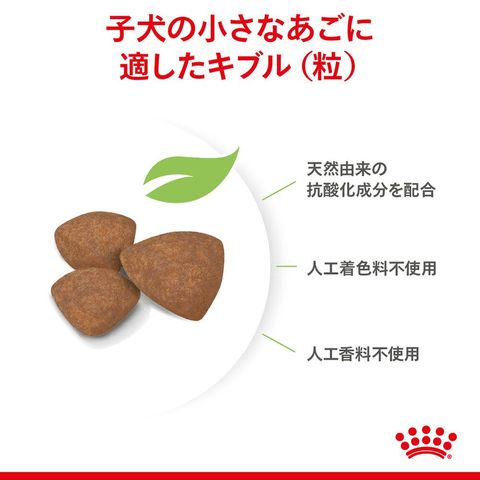 | 特長 | ●ビタミンEとCなど科学的に証明された独自の抗酸化成分を配合し、子犬の健康を維持し、免疫力の発達をサポートします。 ●科学的に証明されたオメガ3系不飽和脂肪酸(DHA)を配合し、子犬の健康的な脳の発達と成長初期のしつけ時の学習をサポートします。 ●プレバイオティックス、高消化性タンパク質および特別に調整された食物繊維の組み合わせが、健康的な消化を維持し、糞便の量と臭いを軽減します。 ●室内で生活する子犬のライフスタイルに配慮し、細やかに調整されたエネルギー含有量で、小型犬の子犬の成長をサポートします。 ●小型犬の子犬に合わせた大きさのキブル(粒)です。 |