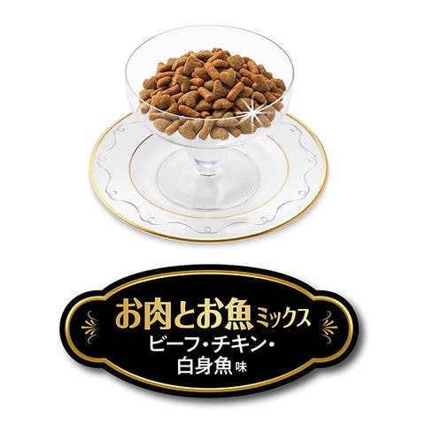 | 特長 | ●”ビーフ、チキン”のお肉の旨みに“白身魚”のおいしさをブレンドしたお肉とお魚、同時に楽しめる欲張りミックスです。 ●猫の健康維持に必要な栄養素をバランスよく配合しました。 ●食べやすい粒サイズとサクサクした食感が特徴です。 ●複数飼育のご家庭に便利な大容量タイプです。 |