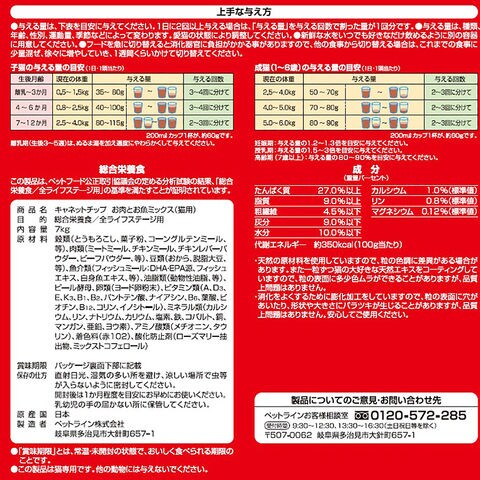 | 保証成分 | たんぱく質:27%以上、脂質:9%以上、粗繊維:4.5%以下、灰分:9%以下、水分:10%以下、カルシウム:1.0%標準値、リン:0.9%標準値、マグネシウム:0.12%標準値 |