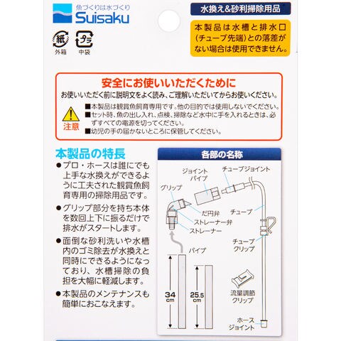 | 特長 | ●プロホースは誰にでも上手な水換えが出来る様に工夫された観賞魚飼育専用の掃除用品です。 ●グリップ部分を持ち本体を数回上下に振るだけで排水がスタートします。 ●面倒な砂利洗いや水槽内のゴミ除去が水換えと同時にできるようになっており、水槽掃除の負担を大幅に軽減します。 |