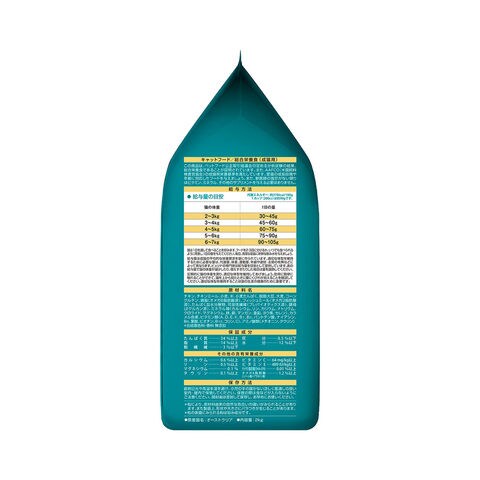 原材料 チキン、チキンミール、小麦、米、小麦たんぱく、脱脂大豆、大麦、コーングルテン、鶏脂(オメガ6脂肪酸源)、フィッシュミール(オメガ3脂肪酸源)、たんぱく加水分解物、可溶性繊維(プレバイオティクス源)、酵母(βグルカン源)、ミネラル類(カルシウム、リン、カリウム、ナトリウム、クロライド、マグネシウム、鉄、銅、マンガン、亜鉛、ヨウ素、セレン)、カラメル色素、ビタミン類(A、D、E、K、B1、B2、パントテン酸、ナイアシン、B6、葉酸、ビオチン、B12、コリン、C)、アミノ酸類(メチオニン、タウリン)