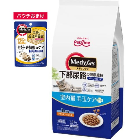 おまけウェット付 キャットフード メディファス 室内猫 毛玉ケアプラス 1歳から チキン&フィッシュ味 1.41kg(235g×6袋) 関東当日便