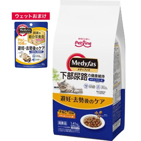 _neko 4902418069463 猫 猫フード ペットライン メディファス 避妊・去勢後のケア 子ねこから10歳まで チキン&フィッシュ味 1.41kg MFD-42 キャットフード 鶏 魚 ドライフード 総合栄養食 下部尿路 去勢 避妊 子ねこ 成猫 10歳 ケア カリカリ pH おしっこ ペーハー ドライ フード おまけ ウェット お試し 避妊 去勢後のケア 子ねこから10歳まで まぐろと若鶏ささみ 50g 4902418880921 bnr2601medwet ari y26m01 20260110