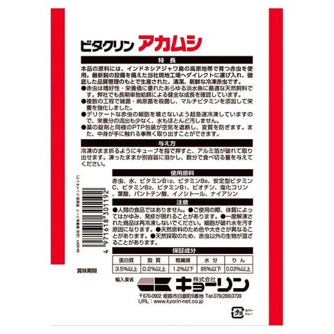 冷凍 キョーリン ビタクリンアカムシ 100g 冷凍赤虫 赤虫 アカムシ アクアリウム用品 金魚・メダカ アクア用品 餌 冷凍餌 熱帯魚 エサ フード ご飯 ゴハン 紫外線殺菌 新鮮 冷凍フード Hikari ディスカス エンゼルフィッシュ 中型熱帯魚 グッピー 小型熱帯魚 金魚 鯉 マルチビタミン 天然飼料 天然 4971618301192 クリーン赤虫 1枚 器具 キョーリン冷凍赤虫セット クリーン clean_akamushi kyourin_ciledakamushi terog89 nos0909 aquyk15 熱帯魚・エビ他 _aqua 日 nama_itome ひかり ひかりクレスト サンショウウオ サラマンダー 20260113 kak y26m01 bnr2602frofood