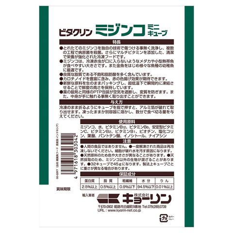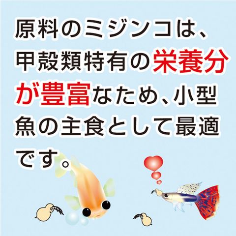 | 原料 | ミジンコ、水、ビタミンB12、ビタミンB6、安定型ビタミンC、ビタミンB2、ビタミンB1、ビオチン、塩化コリン、葉酸、パントテン酸、イノシトール、ナイアシン |