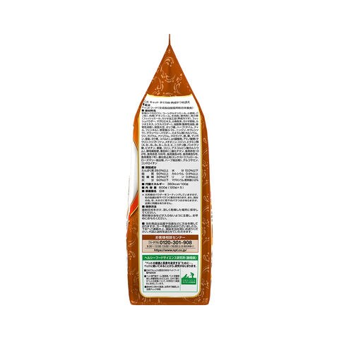 | 原材料 | 穀類(トウモロコシ、コーングルテンミール、小麦粉、パン粉)、肉類(チキンミール、牛肉粉、豚肉粉)、魚介類(フィッシュミール、カツオ加工品(熟成カツオ)、フィッシュパウダー、マグロエキス、小魚粉末、カツオ節粉、カツオエキス、シラスパウダー)、油脂類(動物性油脂、植物性油脂)、脱脂大豆、オリゴ糖、ハーブ(タイム、ディル、フェンネル)、野菜類(トマト、ニンジン、ホウレンソウ)、クランベリーパウダー、ミネラル類(カルシウム、リン、カリウム、ナトリウム、クロライド、鉄、銅、マンガン、亜鉛、ヨウ素、コバルト)、pH調整剤、アミノ酸類(タウリン、トリプトファン、メチオニン、リジン)、ビタミン類(A、B1、B2、B6、B12、D、E、K、ニコチン酸、パントテン酸、ビオチン、葉酸、コリン、アスコルビン酸カルシウム)、酵母細胞壁、着色料(二酸化チタン、食用赤色102号、食用赤色106号、食用黄色4号、食用黄色5号、食用青色1号)、酸化防止剤(ミックストコフェロール、ローズマリー抽出物、ハーブ抽出物)、グルコサミン、コンドロイチン |
