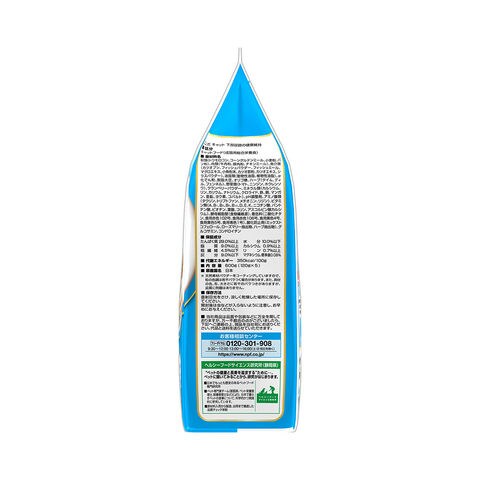 | 原材料 | 穀類(トウモロコシ、コーングルテンミール、小麦粉、パン粉)、肉類(牛肉粉、豚肉粉、チキンミール)、魚介類(カツオブシ、フィッシュパウダー、フィッシュミール、マグロエキス、小魚粉末、カツオ節粉、カツオエキス、シラスパウダー)、油脂類(動物性油脂、植物性油脂)、α化でん粉、脱脂大豆、オリゴ糖、ハーブ(タイム、ディル、フェンネル)、野菜類(トマト、ニンジン、ホウレンソウ)、クランベリーパウダー、ミネラル類(カルシウム、リン、カリウム、ナトリウム、クロライド、鉄、銅、マンガン、亜鉛、ヨウ素、コバルト)、pH調整剤、アミノ酸類(タウリン、トリプトファン、メチオニン、リジン)、ビタミン類(A、B1、B2、B6、B12、D、E、K、ニコチン酸、パントテン酸、ビオチン、葉酸、コリン、アスコルビン酸カルシウム)、酵母細胞壁(食物繊維源)、着色料(二酸化チタン、食用赤色102号、食用赤色106号、食用黄色4号、食用黄色5号、食用青色1号)、酸化防止剤(ミックストコフェロール、ローズマリー抽出物、ハーブ抽出物)、グルコサミン、コンドロイチン |