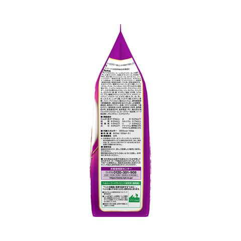 | 原材料 | 穀類(トウモロコシ、コーングルテンミール、小麦粉、パン粉、小麦タンパク)、肉類(チキンミール、牛肉粉、豚肉粉)、魚介類(フィッシュミール、カツオブシ、フィッシュパウダー、魚肉すり身、カツオエキス、マグロエキス、小魚粉末、カツオ節粉、シラスパウダー)、油脂類(動物性油脂、植物性油脂)、でん粉、豆類(脱脂大豆、大豆タンパク)、糖類(トレハロース、オリゴ糖)、ハーブ(タイム、ディル、フェンネル)、コエンザイムQ10、野菜類(トマト、ニンジン、ホウレンソウ)、クランベリーパウダー、ミネラル類(カルシウム、リン、カリウム、ナトリウム、クロライド、鉄、銅、マンガン、亜鉛、ヨウ素、コバルト)、アミノ酸類(タウリン、トリプトファン、メチオニン、リジン)、ソルビトール、ビタミン類(A、B1、B2、B6、B12、D、E、K、ニコチン酸、パントテン酸、ビオチン、葉酸、コリン、アスコルビン酸カルシウム)、酵母細胞壁(食物繊維源)、増粘安定剤(加工でん粉)、pH調整剤、調味料、着色料(アナトー色素、クチナシ赤色素、二酸化チタン、食用赤色102号、食用赤色106号、食用黄色4号、食用黄色5号、食用青色1号)、酸化防止剤(ミックストコフェロール、ローズマリー抽出物、ハーブ抽出物)、グルコサミン、コンドロイチン |