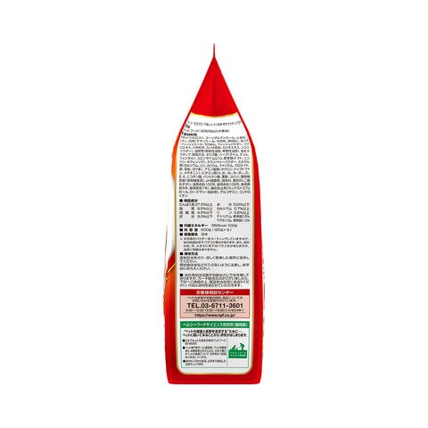 原材料 穀類(トウモロコシ、コーングルテンミール、小麦粉、パン粉)、肉類(チキンミール、牛肉粉、豚肉粉)、魚介類(フィッシュミール、ちりめん、フィッシュパウダー、マグロエキス、小魚粉末、カツオ節粉、カツオエキス、シラスパウダー)、油脂類(動物性油脂、植物性油脂)、焼きタラチップ、脱脂大豆、オリゴ糖、ハーブ(タイム、ディル、フェンネル)、コエンザイムQ10、野菜類(トマト、ニンジン、ホウレンソウ)、クランベリーパウダー、ミネラル類(カルシウム、リン、カリウム、ナトリウム、クロライド、銅、亜鉛、ヨウ素)、アミノ酸類(タウリン、トリプトファン、メチオニン)、ビタミン類(A、B1、B2、B6、B12、D、E、K、ニコチン酸、パントテン酸、葉酸、コリン)、酵母細胞壁(食物繊維源)、pH調整剤、調味料、着色料(二酸化チタン、食用赤色102号、食用赤色106号、食用黄色5号、食用青色1号)、酸化防止剤(ミックストコフェロール、ローズマリー抽出物)、グルコサミン、コンドロイチン