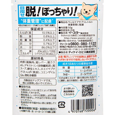 イースター ウェルケア サプリレトルト 体重管理に配慮 50g 4970768720006 犬 パウチ エサ えさ 餌 フード ドッグフード レトルト ご飯 ごはん ダイエット 減量 ぽっちゃり 太り気味 肥満 デキストリン コエンザイム ホエイペプチド 水分補給 ウェットフード ウェット ちょいたし ちょい足し ふりかけ トッピング かけて かける 鶏レバー レバー チキン 鶏肉 酵母 犬フード イヌ いぬ dog DOG 犬用 いぬ用 イヌ用 犬の餌 犬えさ 犬餌 えさ エサ ペットフード どっぐふーど ウエットフード ウエット おやつ オヤツ 間食 栄養補完食 オールステージ 成犬 アダルト ミドル シニア 高齢犬 老犬 体重ケア 体重管理 満腹感 Well_Care 国産 日本産 20260311 y26m04 ngtk