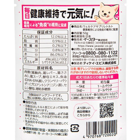 イースター ウェルケア サプリレトルト 健康維持による免疫の維持に配慮 50g 犬 パウチ エサ えさ 餌 フード ドッグフード レトルト ご飯 ごはん 免疫 免疫ケア DHA EPA プロアントシアニジン セレン 水分補給 ウェットフード ウェット ちょいたし ちょい足し ふりかけ 鶏レバー レバー チキン 酵母 4970768720020 犬フード イヌ いぬ dog DOG 犬用 いぬ用 イヌ用 犬の餌 犬えさ 犬餌 えさ ペットフード どっぐふーど ウエットフード ウエット おやつ オヤツ 間食 トッピング 栄養補完食 かける かけて オールステージ 成犬 アダルト ミドル シニア 高齢犬 老犬 鶏肉 クランベリーパウダー Well_Care 国産 日本産 20260311 y26m04 ngtk