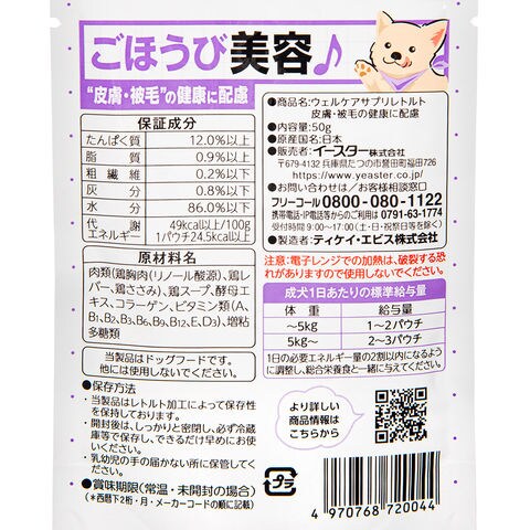 イースター ウェルケア サプリレトルト 皮膚・被毛の健康に配慮 50g 犬 パウチ エサ えさ 餌 フード ドッグフード レトルト ご飯 ごはん 肉 鶏肉 スープ 鶏ガラ シニア 水分補給 ウェットフード ウェット ちょいたし ちょい足し ふりかけ 鶏レバー レバー チキン 酵母 4970768720044 毛 毛並み ビタミン 抜け毛 コラーゲン 肌 犬フード イヌ いぬ dog DOG 犬用 いぬ用 イヌ用 犬の餌 犬えさ 犬餌 えさ ペットフード どっぐふーど ウエットフード ウエット おやつ オヤツ 間食 トッピング 栄養補完食 かける かけて オールステージ 成犬 アダルト ミドル シニア 高齢犬 老犬 ビタミン リノール酸 皮膚 被毛 ハリ ツヤ Well_Care 国産 日本産 20260311 y26m04 ngtk