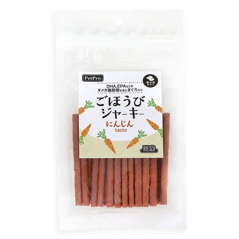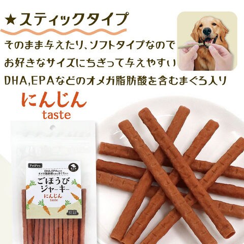 メーカー画像 ペットプロ ごほうびジャーキー にんじん 100g 4981528000405 犬 イヌ 犬用 いぬ用 dog 犬フード ドッグフード 犬おやつ おやつ トリーツ 間食 犬の餌 犬えさ 犬餌 ペットフード ジャーキー ソフト 柔らかい ちぎって 与えやすい 高齢犬 シニア犬 老犬 生後6か月から マグロ 鮪 鶏肉 チキン 人参 DHA EPA オメガ脂肪酸 国産 日本産 20260203 y26m02 ngtk