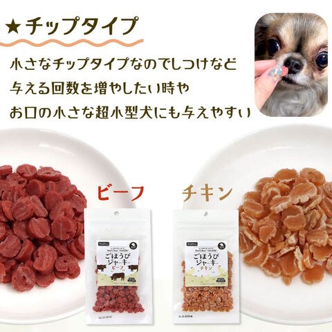 | 特長 | ●ワンちゃんが大好きなチキン味のジャーキーです。 ●しつけなど与える回数を増やしたい時やお口の小さな超小型犬に与えやすい小さなチップタイプです。 ●1粒約1.6kcalです。 |