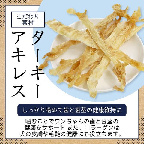 | 特長 | ●貴重なターキーのアキレス腱を長く楽しめるロングタイプのおやつです。 ●噛むことでワンちゃんの歯と歯茎の健康をサポートします。 ●コラーゲンは皮膚や毛艶の健康にも役立ちます。 |