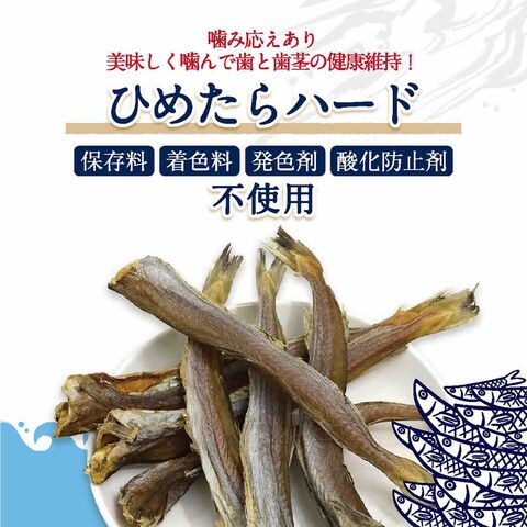 | 特長 | ●ひめたらの美味しさを丸ごと味わえるハードタイプの国産無添加おやつです。 ●鱈は白身魚で高たんぱくな食材でビタミンB12やヨウ素・カルシウム・DHA・EPAといった栄養素が豊富に含まれています。 ●噛み応えがあるので、美味しく噛んで歯と歯茎の健康維持をサポートします。 |
