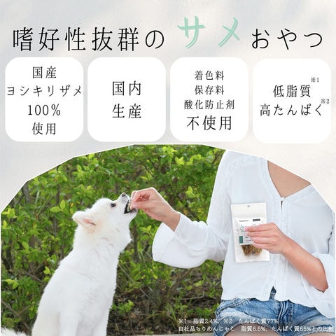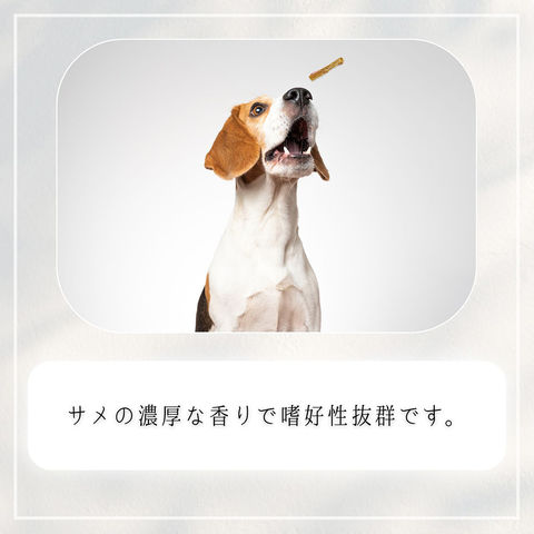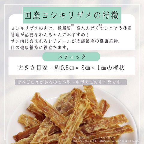 | 特長 | ●ヨシキリザメを100%使用したスティックタイプの国産無添加おやつです。 ●ヨシキリザメの肉は、低脂質、高たんぱくでシニアや体重管理が必要なわんちゃんにおすすめです。 ●サメ肉に含まれるレチノールが皮膚被毛の健康維持、目の健康維持に役立ちます。 ●食べごたえがあるので小型~中型犬におすすめです。 |