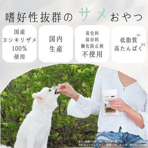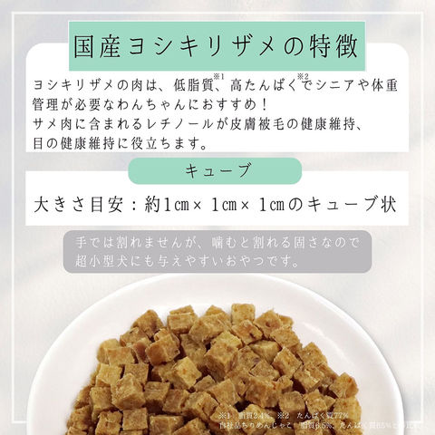 | 特長 | ●ヨシキリザメを100%使用したキューブタイプの国産無添加おやつです。 ●ヨシキリザメの肉は、低脂質、高たんぱくでシニアや体重管理が必要なわんちゃんにおすすめです。 ●サメ肉に含まれるレチノールが皮膚被毛の健康維持、目の健康維持に役立ちます。 ●手では割れませんが、噛むと割れる固さなので超小型犬にも与えやすいです。 |
