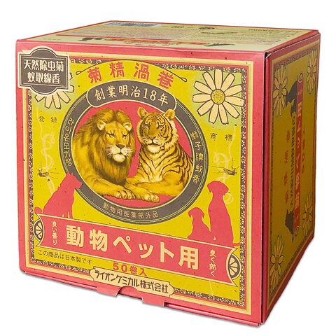 | 特長 | ●大正8年発売当時のレトロなイメージをそのままに復刻した『菊精渦巻』の動物用です。 ●フィラリアを媒介する蚊からペットを守ります。 ●天然素材100%!けむりは優しく、昔懐かしい香りがお楽しみ頂けます。 ●長時間効果が持続する大型サイズ。さらにたっぷり使える50巻入りです。 |