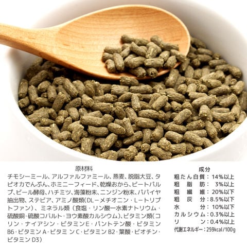 | 原材料 | チモシーミール、アルファルファミール、燕麦、脱脂大豆、タピオカでんぷん、ホミニーフィード、乾燥おから、ビートパルプ、ビール酵母、ハチミツ、海藻粉末、ニンジン粉末、パパイヤ抽出物、ステビア、アミノ酸類(DL-メチオニン・L-トリプトファン) 、ミネラル類(食塩・リン酸一水素ナトリウム・硫酸銅・硫酸コバルト・ヨウ素酸カルシウム)、ビタミン類(コリン・ナイアシン・ビタミンE・パントテン酸・ビタミンB6・ビタミンA・ビタミ ンC・ビタミンB2・葉酸・ビオチン・ビタミンD3) |