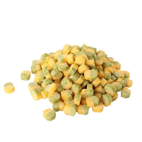 | 原材料 | 小麦粉、鶏ささみ、ショートニング、さつま芋パウダー、ほうれん草パウダー、食塩、ソルビトール、プロピレングリコール、膨張材、着色料(黄4、黄5、青1、酸化チタン)、保存料(ソルビン酸K)、pH調整剤、酸化防止剤(エリソルビン酸Na)、香料 |