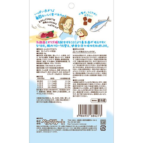 | 特長 | ●旨みたっぷりのマグロを特殊ふんわり加工しっとり仕上げのおやつにしました。 ●腸内フローラを整え、健康な消化吸収を維持します。 |