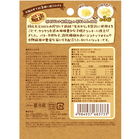 メーカー画像 ペッツルート おからクッキー プレーン 40g 4984937683733 20260224 y26m02 cngc 犬 イヌ いぬ dog DOG 犬おやつ おやつ dogfood ドッグフード ドックフード 間食 スナック クッキー 手焼き 手作り 満足感 膨らむ ご褒美 ごほうび 国産 日本 日本産 植物性原料 国産大豆 国産大豆100% 大豆 新鮮 生おから おから サクサク バター不使用 消化吸収 ココナッツオイル 食物繊維 菊いも 無添加 グルテンフリー カロリーコントロール 厳選