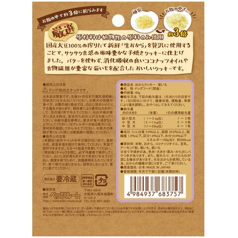 メーカー画像 ペッツルート おからクッキー 紫いも 40g 4984937683757 20260224 y26m02 cngc 犬 イヌ いぬ dog DOG 犬おやつ おやつ dogfood ドッグフード ドックフード 間食 スナック クッキー 手焼き 手作り 満足感 膨らむ ご褒美 ごほうび 国産 日本 日本産 植物性原料 国産大豆 国産大豆100% 大豆 新鮮 生おから おから サクサク バター不使用 消化吸収 ココナッツオイル 食物繊維 菊いも 紫いも 無添加 グルテンフリー カロリーコントロール 厳選