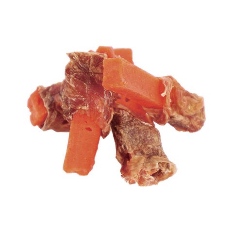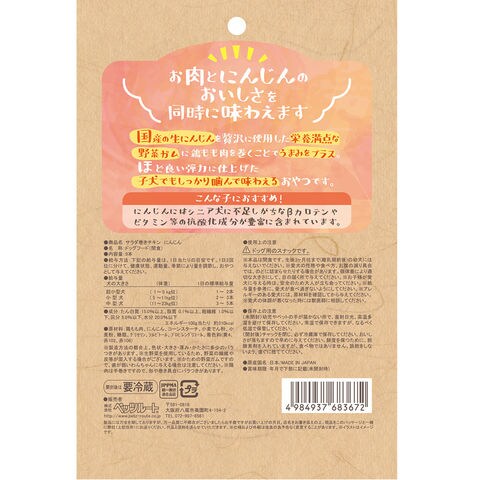 | 特長 | ●国産の生にんじんを贅沢に使用した栄養満点な野菜ガムに、鶏もも肉を巻くことでうまみをプラスしたおやつです。 ●ほど良い弾力にしあげることで、子犬でもしっかり噛んで味わえます。 ●にんじんにはシニア犬に不足しがちなβカロテンや、ビタミン等の抗酸化成分が豊富に含まれています。 ●あじわい深いもも肉を巻いた野菜ガムを食べることで、歯と歯茎と体の健康を維持します。 |