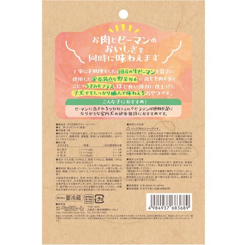 | 原材料 | 鶏もも肉、ピーマン、コーンスターチ、小麦でん粉、小麦粉、糖類、グリセリン、ソルビトール、プロピレングリコール、着色料(黄4、青1) |