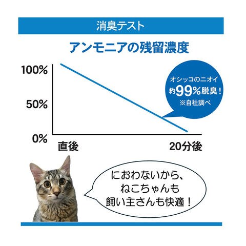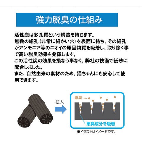 | 特長 | ●紙製の猫砂です。 ●活性炭を配合し、オシッコのニオイを強力脱臭します。 ●濡れた部分がブルーに変わり、素早くしっかり固まります。 ●燃やせるから取り捨てが簡単です。(各自治体の指示に従ってください) |