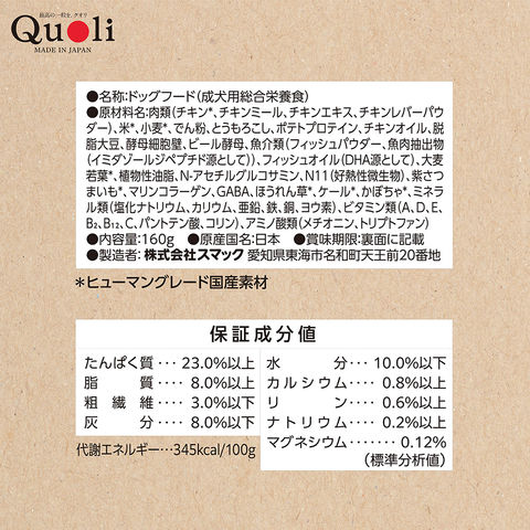 メーカー画像 ドッグフード Quoli(クオリ) シニア犬用 チキン 160g 獣医師監修 4970022014841 スマック 犬フード 犬 イヌ dog 犬用 いぬ用 犬の餌 犬えさ 犬餌 ペットフード カリカリ シニア犬 高齢犬 老犬 11歳以上 総合栄養食 筋力 体力 関節 腎臓 健康維持 健康をサポート N-アセチルグルコサミン マリンコラーゲン DHA 低たんぱく 低リン 低ナトリウム 品質管理 新鮮パック ヒューマンクオリティ ヒューマングレード 日本品質 厳選素材 鶏肉 野菜 国産 日本産 20260108 y26m01 ngtk
