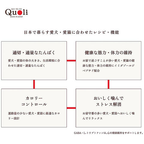 | 特長 | ●理想的な栄養バランスを追求した獣医師監修の総合栄養食ドライフードです。 ●国産にこだわったヒューマングレード・厳選素材を使用し、徹底管理されたクリーンなフードキッチンで調理をしています。 ●単に美味しいだけでなく、家族の健康を第一に考えたフード作りにこだわりました。 |