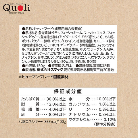 メーカー画像 キャットフード Quoli(クオリ) グレインフリー 成猫用 まぐろ 150g 獣医師監修 4970022025052 スマック 猫フード 猫 ネコ ねこ cat CAT 猫用 ねこ用 ネコ用 猫の餌 猫餌 ペットフード きゃっとふーど カリカリ 1歳以上 成猫 総合栄養食 消化吸収 穀物アレルギー 穀物不使用 筋力 体力 健康維持 健康をサポート 品質管理 新鮮パック ヒューマンクオリティ ヒューマングレード 日本品質 厳選素材 マグロ 鮪 フィッシュ 野菜 国産 日本産 20260113 y26m01 ngtk