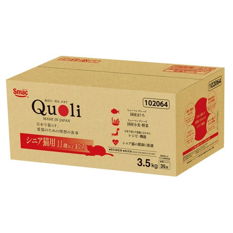 メーカー画像 キャットフード Quoli(クオリ) シニア猫用 まぐろ 3.5kg 100g×35袋 獣医師監修 4970022025342 スマック 猫フード 猫 ネコ ねこ cat CAT 猫用 ねこ用 ネコ用 猫の餌 猫餌 ペットフード きゃっとふーど カリカリ 総合栄養食 11歳以上 シニア猫 高齢猫 老猫 筋力 体力 下部尿路 健康維持 健康をサポート 低たんぱく 低リン 低ナトリウム DHA マグネシウム含有量調整 低カルシウム 品質管理 新鮮パック 大容量 ヒューマンクオリティ ヒューマングレード 日本品質 厳選素材 マグロ 鮪 フィッシュ 野菜 国産 日本産 20260113 y26m01 ngtk