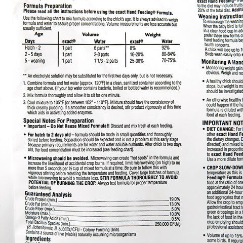 | 特長 | ●生後2週間未満の中型・大型インコの幼鳥向けに配合されたフードです。(オウムには推奨されません) ●バランスのとれた高栄養配合で、赤ちゃんの成長を早め、離乳を早め、より強く明るい羽毛を育てます。 ●腸内微生物の健康な増殖を促すプロバイオティクスが含まれています。 ●消化酵素が含まれているため、炭水化物とタンパク質の消化をサポートし、消化不良を軽減するのに役立ちます。 |