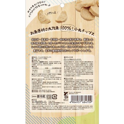 | 特長 | ●保存料・着色料・発色剤・酸化防止剤不使用で、厳選した太刀魚を使用して作ったパリッとした食感のチップスです。 ●シニア期には特にうれしいDHA・EPAやビタミンA・Dも豊富です。 ●幼犬、シニア犬におすすめです。 |