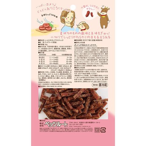 | 特長 | ●素材そのものの風味と旨味をぎゅっ!小切りでしっとりやわらかく何度も与えられるおやつです。 ●旨味たっぷり牛タンでたんぱく質を補給。 ●小型犬、シニア犬におすすめです。 |