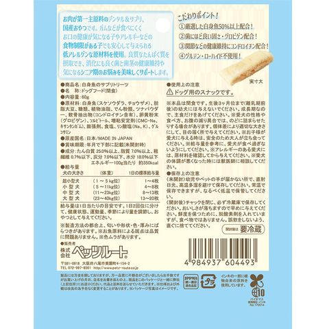 メーカー画像 ペッツルート もっとやさしい 白身魚のサプリトリーツ 60g 犬 おやつ 4984937604493 イヌ 犬用 いぬ用 dog 犬フード ドッグフード 犬おやつ サプリメントおやつ サプリおやつ トリーツ サプリトリーツ スナック 間食 サプリメント 犬の餌 犬えさ 犬餌 ペットフード 高齢犬 シニア犬 老犬 低アレルゲン デンタルケア 歯にほど良い固さ 消化に良い 歯 歯茎 膝 股関節 健康維持 白身魚 ホワイトフィッシュ タラ チョウザメ グロビゲン コンドロイチン グルコサミン グルテンフリー ローハイドフリー 牛皮フリー ひとくちサイズ 丸飲みしにくい 無添加 国産 日本産 petzroute_treats kak y26m01 20260111