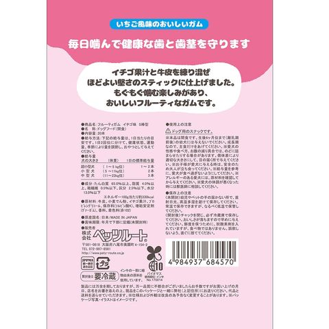 メーカー画像 ペッツルート フルーティガム イチゴ S棒型 20本 犬 おやつ ハミガキガム 4984937684570 犬フード いぬ 犬おやつ ガム 苺 いちご果汁 いちご味 苺味 フルーティ 小麦 牛 牛皮 うし 棒型 棒状 S ドッグフード ドッグ デンタルケア はみがき 歯磨き 超小型犬 小型犬 中型犬 スナック 歯 歯茎 歯ぐき ザクザク コラーゲン 間食 チャック チャック付き 684570 国産 日本産 かため 堅め 硬め petzroute_treats kak y26m01 20260111