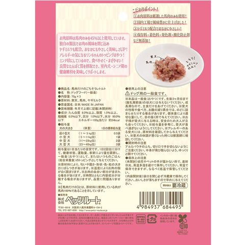 メーカー画像 ペッツルート 馬肉だけのごちそうレトルト 70g×3袋 ドッグフード 4984937684495 犬フード 犬 いぬ おやつ 犬おやつ 無添加 国産 レトルト パウチ ウェット ウエット 柔らかい やわらかい ごちそう 馬 うま 馬肉 グルテンフリー トッピング ヤギミルク 鉄分 寒天 食物繊維 ミンチ 室内犬 シニア シニア期 たんぱく質 老犬 684495 kak y26m01 20260111