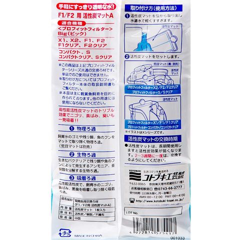 | 特長 | ●本品はプロフィットフィルター他コトブキ工芸製品専用交換マットです。 ●高性能活性炭マットのトリプル効果で、ニゴリ・黄ばみ・臭いを一発吸着します。 ●物理ろ過:飼育水のゴミや残り餌、魚のフンをマットで取り除きます。 ●生物ろ過:生きたバクテリアで残り餌や魚のフンによって発生するアンモニア、亜硝酸を分解します。 ●吸着ろ過:高性能活性炭で、飼育水のニゴリ、黄ばみ、悪臭を吸着し取り除きます。 ●交換用や、予備として持っておくのもおすすめです。 |