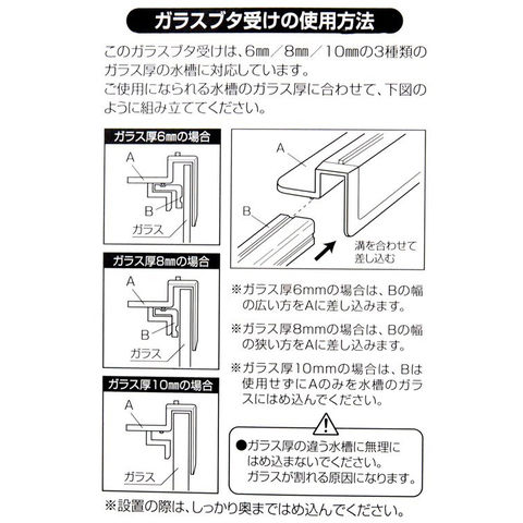 特長 ●ガラス厚6・8・10mmの水槽に対応するガラスフタ受けです。