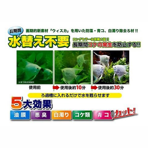 | 特長 | ●水槽や外掛けフィルターに貼るだけで、簡単にご使用いただけます。 ●緑藻類の発生予防に優れた効果を発揮します。 ●約1ヶ月間水槽内を美しく保つことができます。 ●pH(ペーハー)値を変化させないため安心です。 |
