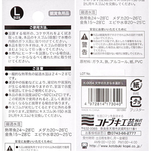 | ご注意 | ※本品は観賞魚用の水温計です。他の目的では使用しないでください。 ※一般的な熱帯魚の最適水温は24~28℃です。 ※本品の表示温度は0~50℃(±2℃)です。この範囲外で使用されると、故障する場合があります。 |