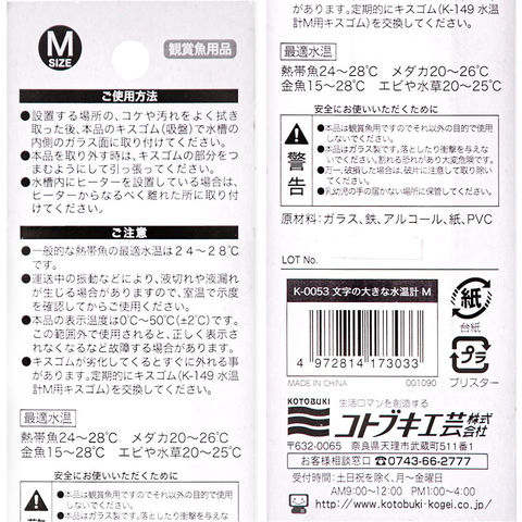 | ご注意 | ※本品は観賞魚用の水温計です。他の目的では使用しないでください。 ※一般的な熱帯魚の最適水温は24~28℃です。 ※本品の表示温度は0~50℃(±2℃)です。この範囲外で使用されると、故障する場合があります。 |