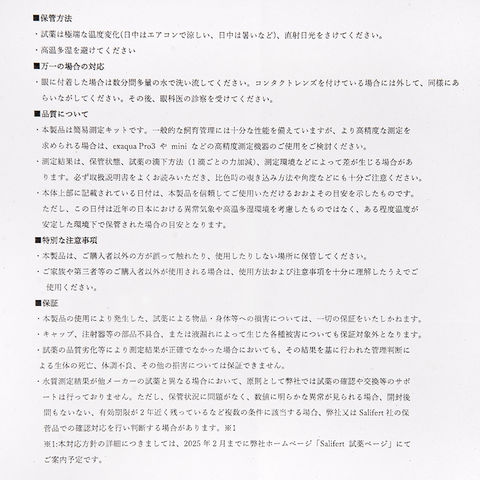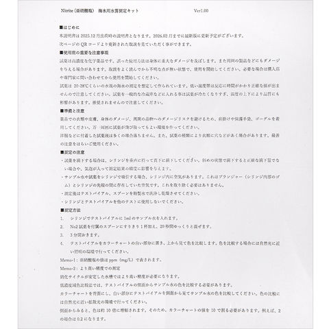 | ご注意 | ※本品はアクアリウム用水質検査キットです。目的以外の用途では使用しないでください。 ※保護手袋・マスク等、必要に応じた保護具を用意し着用してください。 ※検査中の飲食や喫煙は行わないでください。 ※水が着色している場合は、検査前に脱色処理を行ってください。 ※正確な判定のため、明るい場所で結果をご確認ください。 |