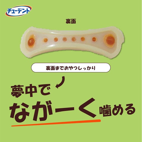 | 特長 | ●おやつとおもちゃの2種類の楽しみを持つ、食べられる歯みがきおもちゃです。 ●外側のおもちゃ部分、内側にベーコンフレーバーのおやつが埋め込まれており、裏面までおやつがしっかり入っているので夢中でながーく?み続けられます。 ●持ちやすくて、噛みやすい丈夫なナイロン素材でしっかり噛んでも長持ちです。 ●楽しくカミカミすることで、唾液の分泌が促進され歯の汚れを落とします。 |