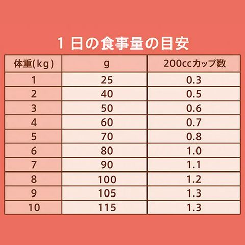 | 与え方 | ●パッケージ記載の給与量を目安に、愛猫の運動量に合わせて与える量を加減してください。 ●フードの切り替え・給与量の変更は、徐々に行ってください。 ●常に清潔で新鮮な飲み水をご用意ください。 ●そのまま、もしくは少し湿らせて与えてください。 |